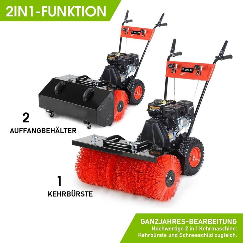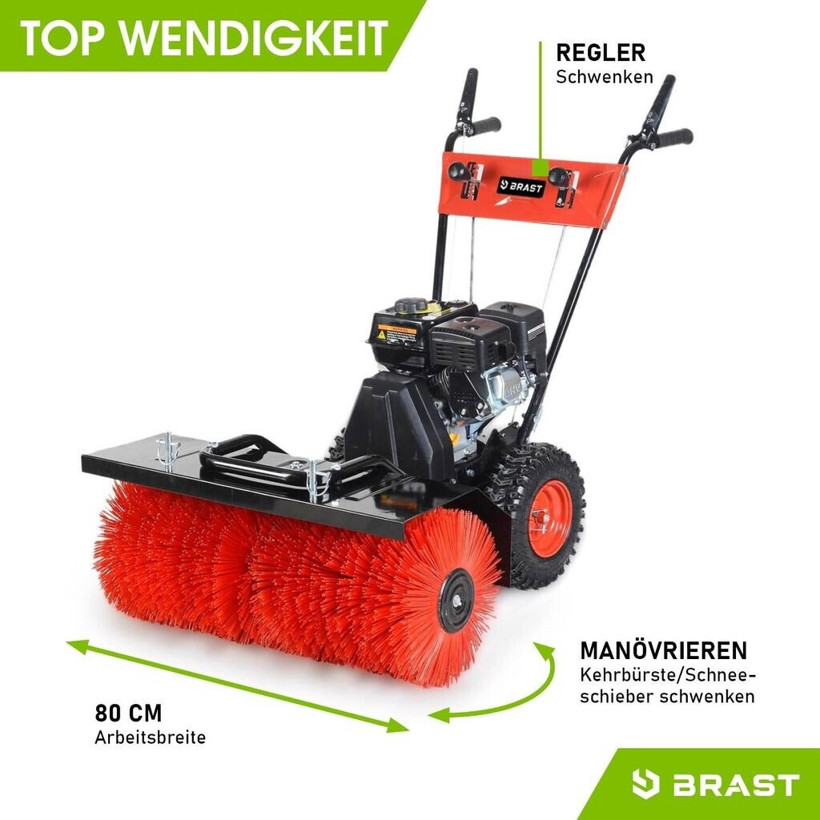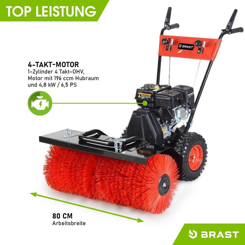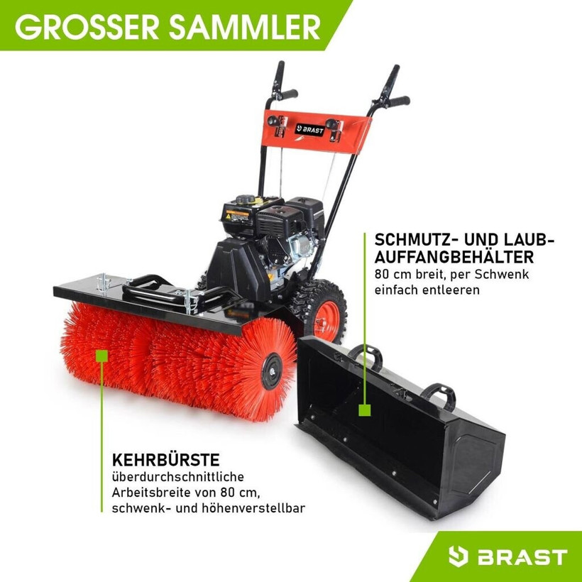 Die Brast Benzin-Kehrmaschine bietet mit ihrer 80 cm Arbeitsbreite und dem leistungsstarken 6,5 PS 4-Takt-Motor eine effiziente Lösung für die Reinigung großer Flächen. Ausgestattet mit Antriebsrädern, sorgt sie für müheloses Manövrieren.