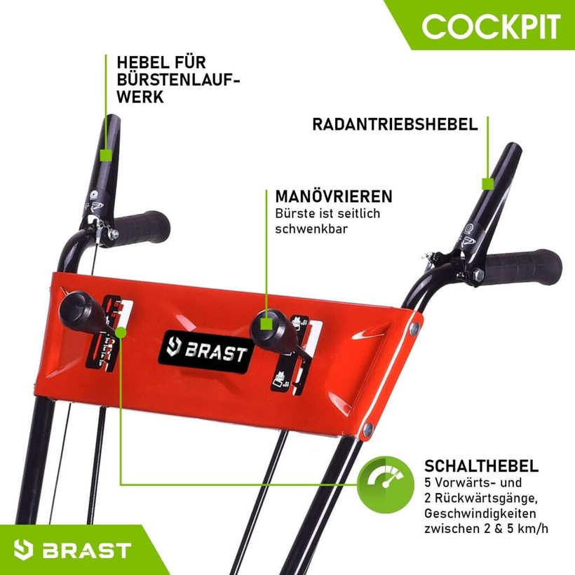 Die vielseitige Brast Kehrmaschine verfügt über eine höhenverstellbare Kehrbürste und bietet sowohl Seilzug- als auch Elektrostart für maximalen Komfort.