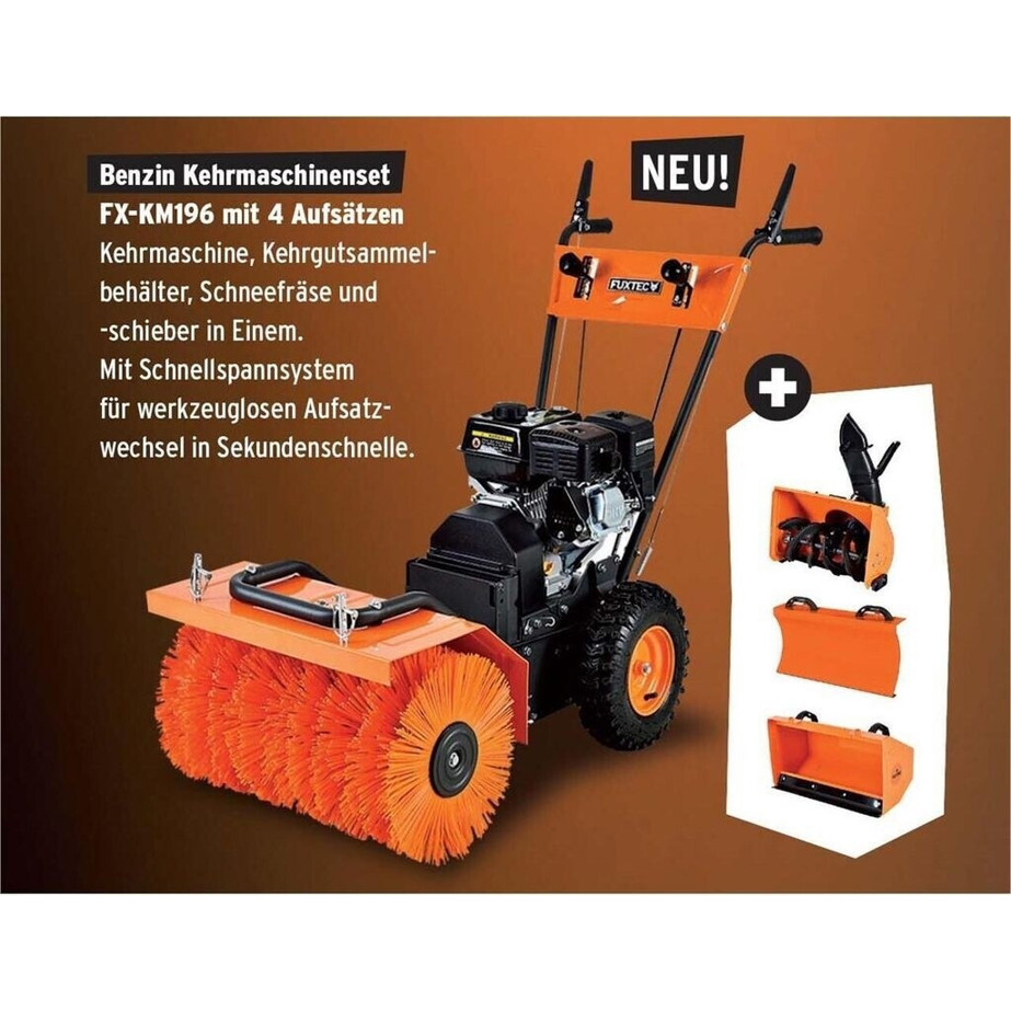 Die FUXTEC FX-KM196 SET1 ist eine vielseitige Benzin-Kehrmaschine, die mit umfangreichem Zubehör wie Kehrgutbehälter, Schneeräumschild und Schneefräsenkopf geliefert wird, um für alle Jahreszeiten gerüstet zu sein.