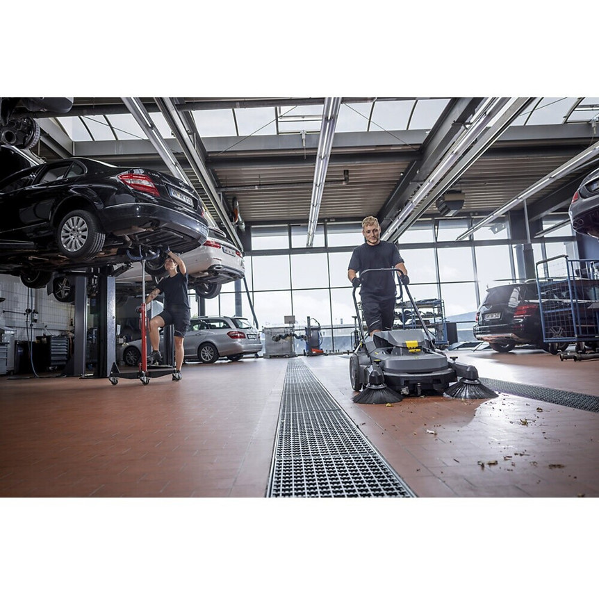 Die Kärcher KM 70/30 C Bp 2SB verfügt über eine höhenverstellbare Kehrbürste und einen klappbaren Schubbügel, die eine komfortable Handhabung und Anpassung an verschiedene Anwender und Reinigungsbedingungen ermöglichen.