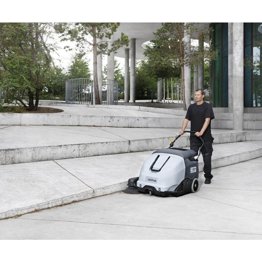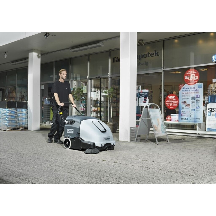 Die Nilfisk SW 900 B kombiniert eine hohe Flächenleistung von 4.725 m²/h mit einem leisen Betrieb von 70 dB, ideal für geräuschsensible Bereiche. Dank der Staubabsaugung wird die Arbeitsumgebung staubfrei gehalten.