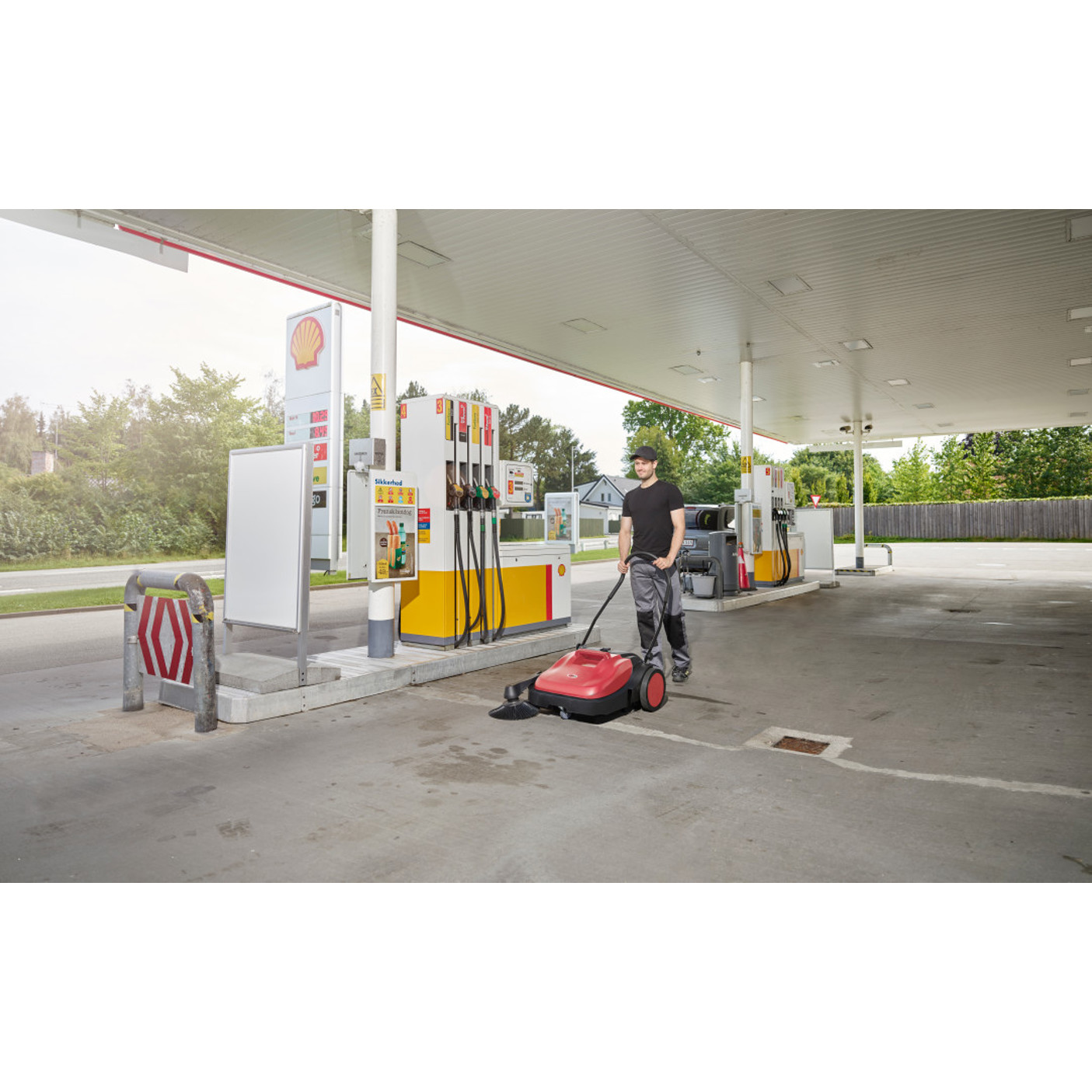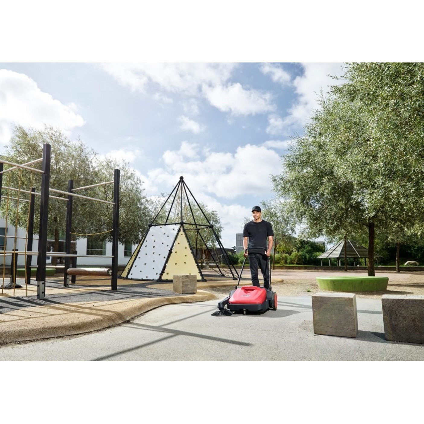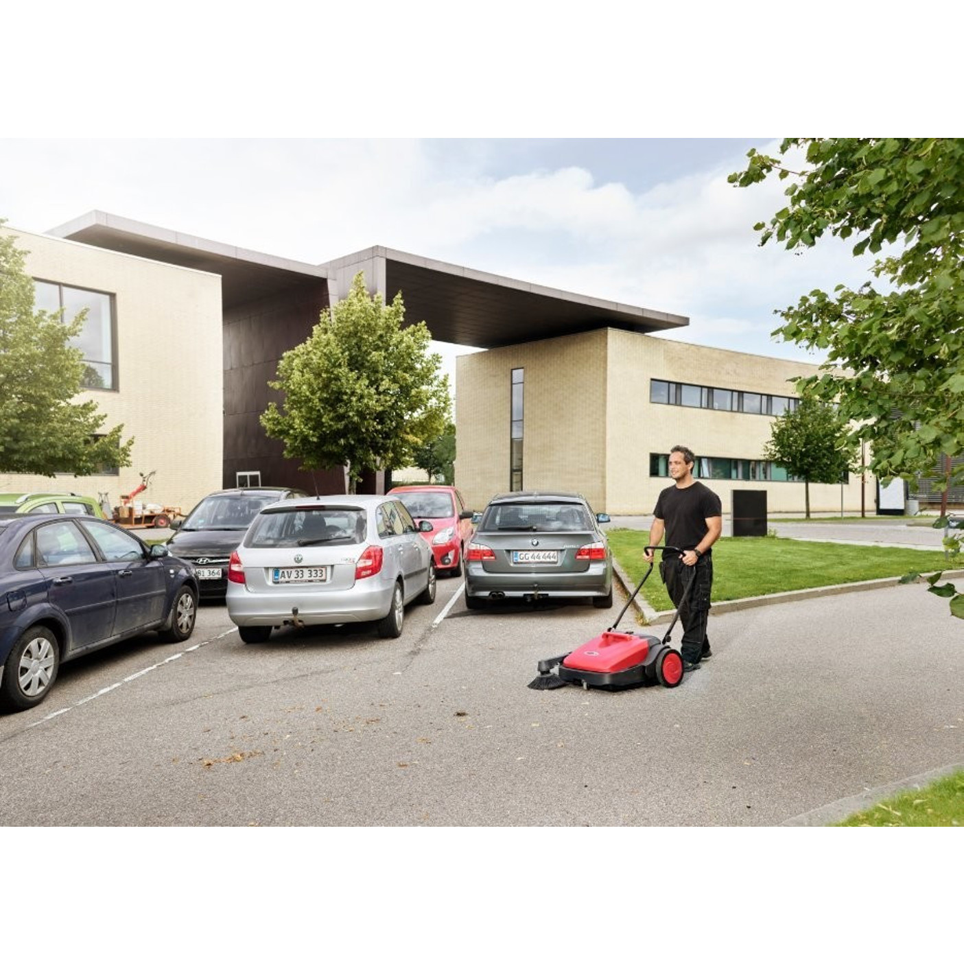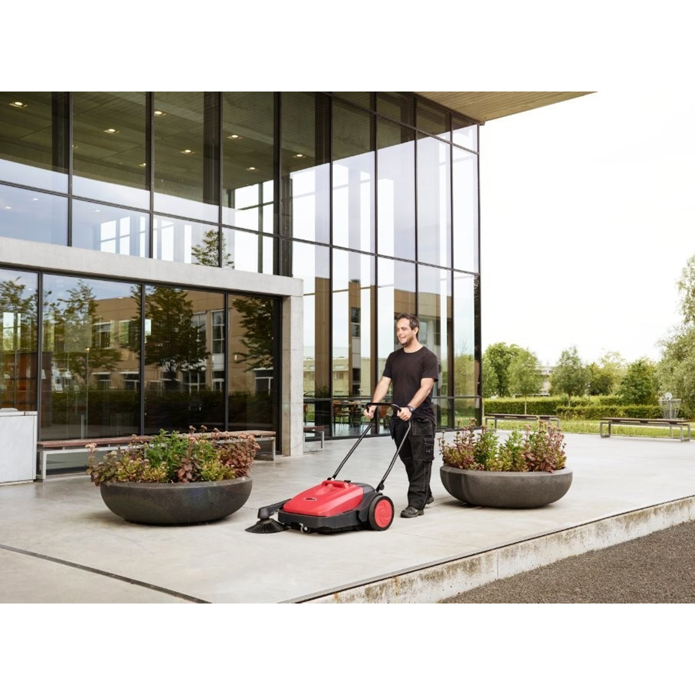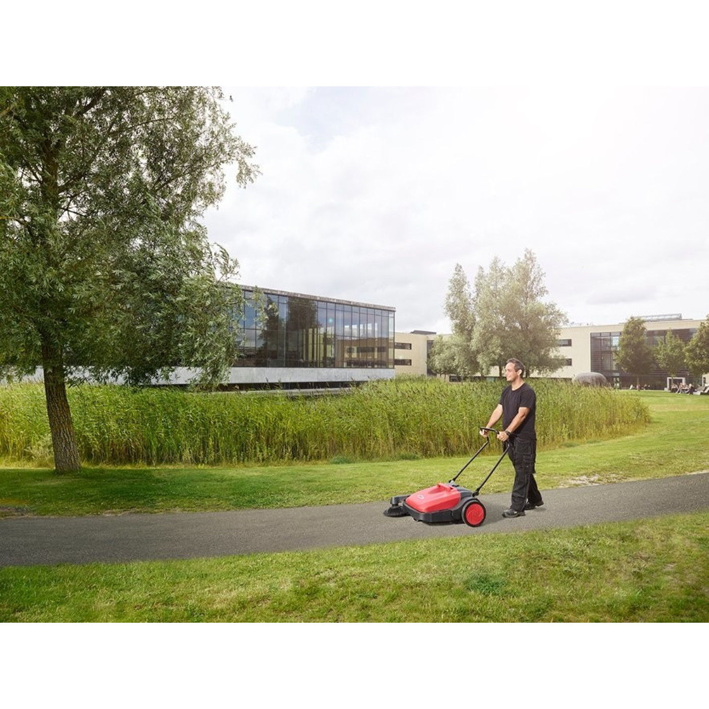 Dank des manuellen Antriebs ist die Kehrmaschine jederzeit einsatzbereit und durch den klappbaren Schubbügel platzsparend zu verstauen. Kunststoffräder sorgen für eine leichte Manövrierbarkeit auf verschiedenen Untergründen.